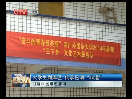2014年7月上旬到8月中旬,校团委细致筹划实施,克服困难,努力做好暑期“三下乡”组织工作,因服务队内容丰富、形式新颖,尤其是针对非物质文化遗产而开展的文化艺术服务下乡项目,得到重庆日报和重庆电视台等新闻媒体的报道。