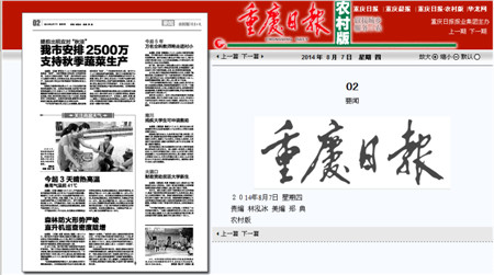 8月7日,重庆日报农村版《要闻》刊载图文,报道了我校暑期“三下乡”赴云阳文化艺术服务队的师生在云阳县盘龙街道敬老院服务,为老人们表演精彩的文艺节目,还为老人们打扫房间。8月16日,重庆电视台新闻频道《630晚新闻》也对我校赴云阳“三下乡”服务队做了题为《大学生到库区,传承巴渝“非遗”》的报道。
