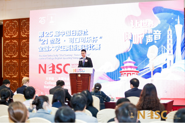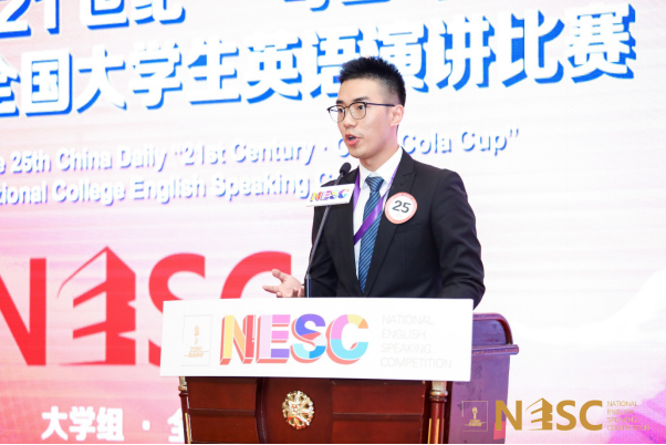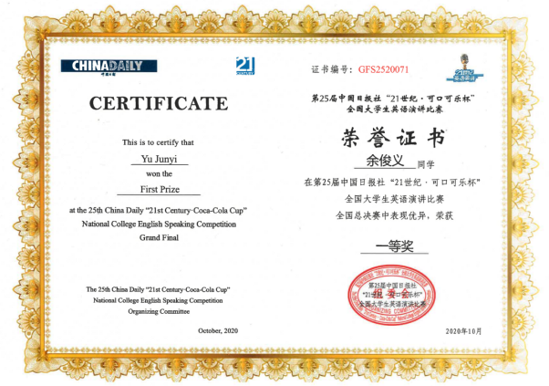 2020年10月7日上午,第25届中国日报社“21世纪·可口可乐杯”全国大学生英语演讲比赛全国总决赛于广州白云国际会议中心圆满落幕。我校英语学院2017级余俊义同学,在林珲老师指导下,以出色的表现荣获全国总决赛一等奖及可口可乐“在乎力”特别奖。
