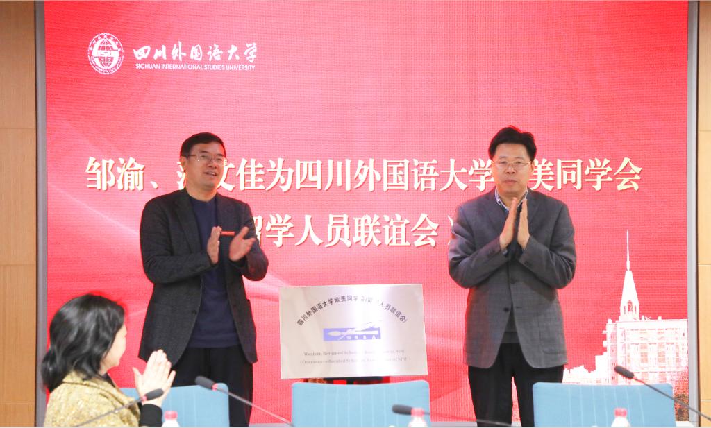 会上,学校党委统战部长檀春耕宣布了第一届理事会及班子名单:校长董洪川当选名誉会长,副校长祝朝伟当选会长,李大雪、王伟、张幼斌当选副会长,朱天祥当选秘书长,朱士松、周超、唐果、游涵当选副秘书长。邹渝书记与范文佳秘书长一同为四川外国语大学欧美同学会揭牌。