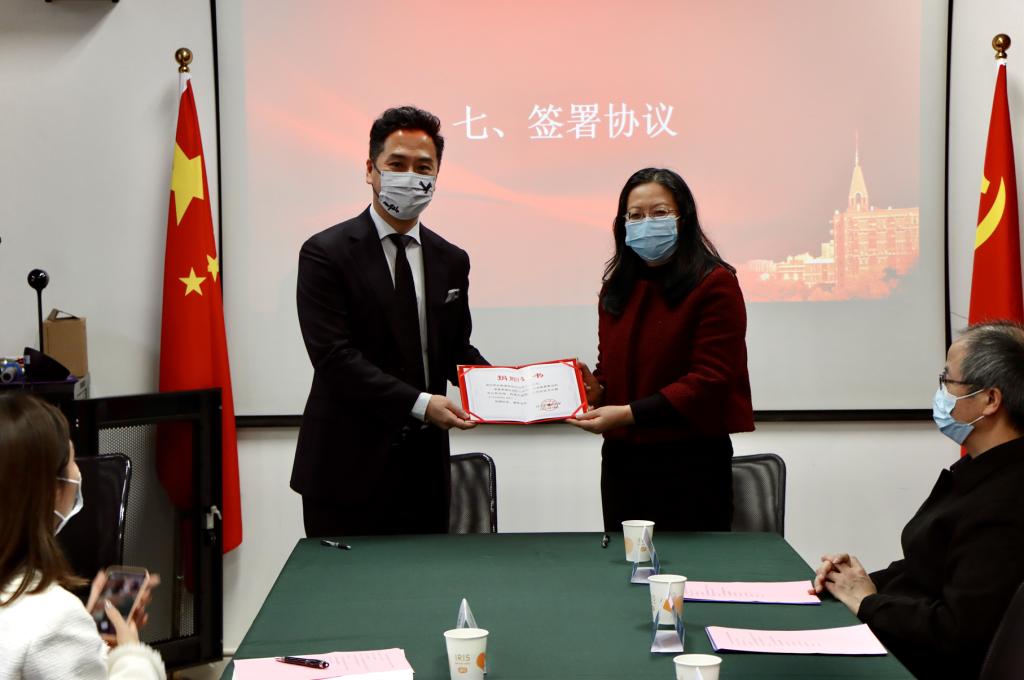 仪式上,双方签署了捐赠协议。谢元胜秘书长代表基金会接受捐赠,段玲琍院长代表学校向捐赠方颁发证书。