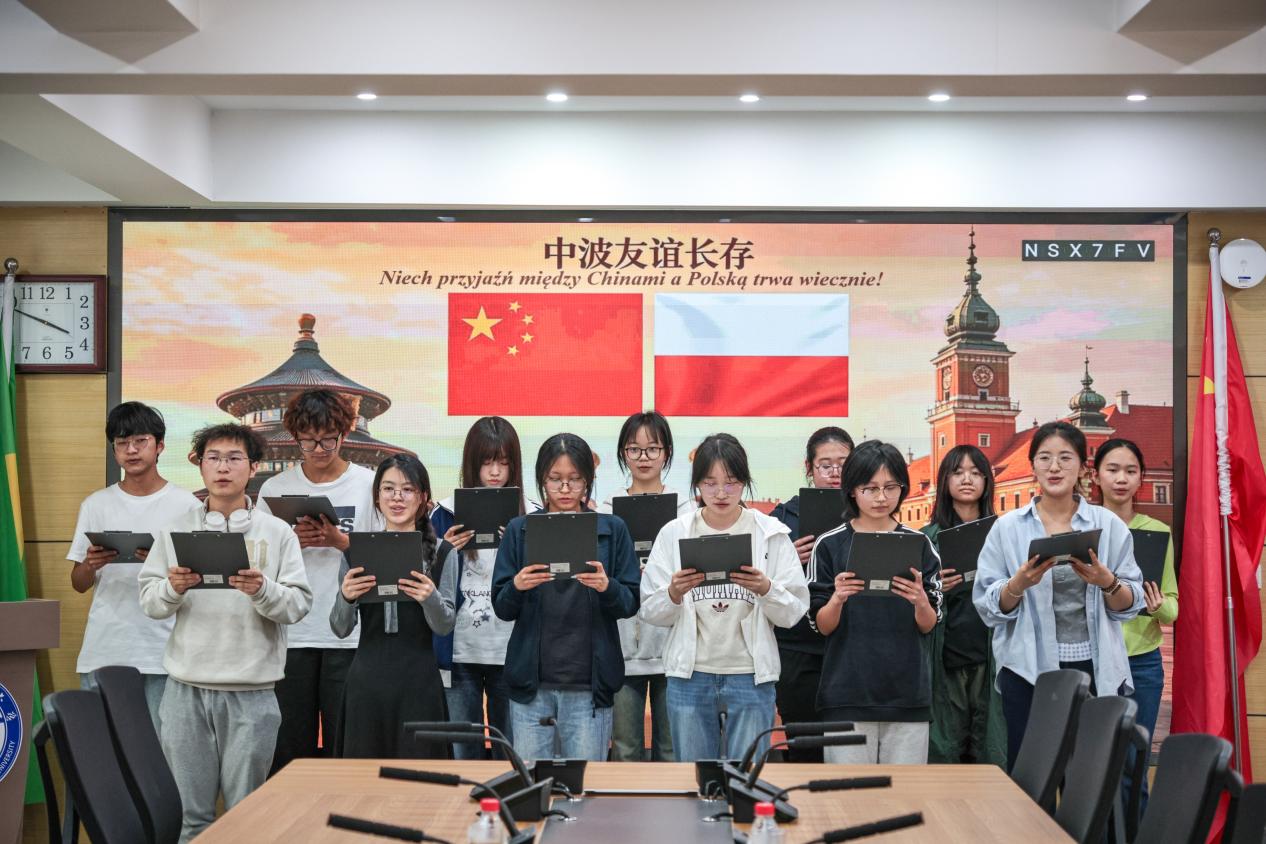 随后,彼得·诺沃特尼亚克总领事一行与我校西方语言文化学院波兰语专业师生进行友好交流。波兰语专业学生为总领事一行演唱了波兰语版歌曲《友谊地久天长》,展现了同学们良好的精神风貌和出色的语言水平。总领事先生解答了同学们关于波兰文化方面的问题,鼓励波兰语专业的学生们勤学苦练,努力成为中波友好交流的桥梁与使者。同时,他也期待未来能有更多合作机会,进一步促进川外和波兰的教育文化交流。