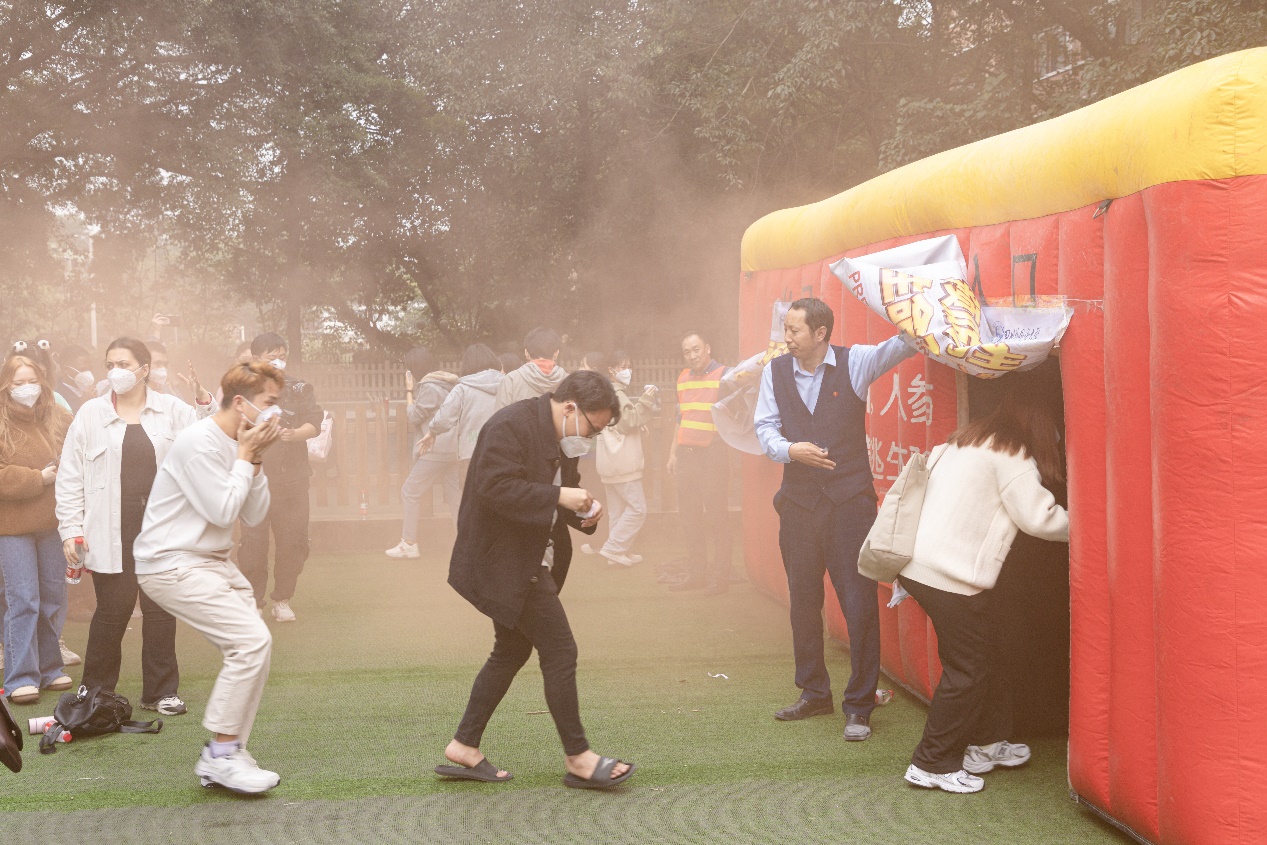 接着,同学们来到空地前,根据工作人员“一拔二提三压”的操作要求,学会了使用灭火器并逐一扑灭了火盆。在事先准备好的充气逃生屋中,同学们还依次学习体验了模拟黑夜环境中的逃生方法。