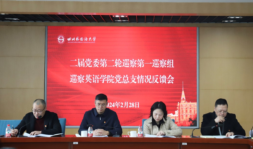2024年2月28日上午10点半,二届党委第二轮巡察第一巡察组巡察英语学院党总支情况反馈会在立德楼C517召开。党委书记邹渝、党委副书记苟朝莉、第一巡察组全体成员、相关职能部门负责人,以及英语学院领导班子和教职工代表参加了此次会议。情况反馈会由英语学院党总支书记淡修安主持。