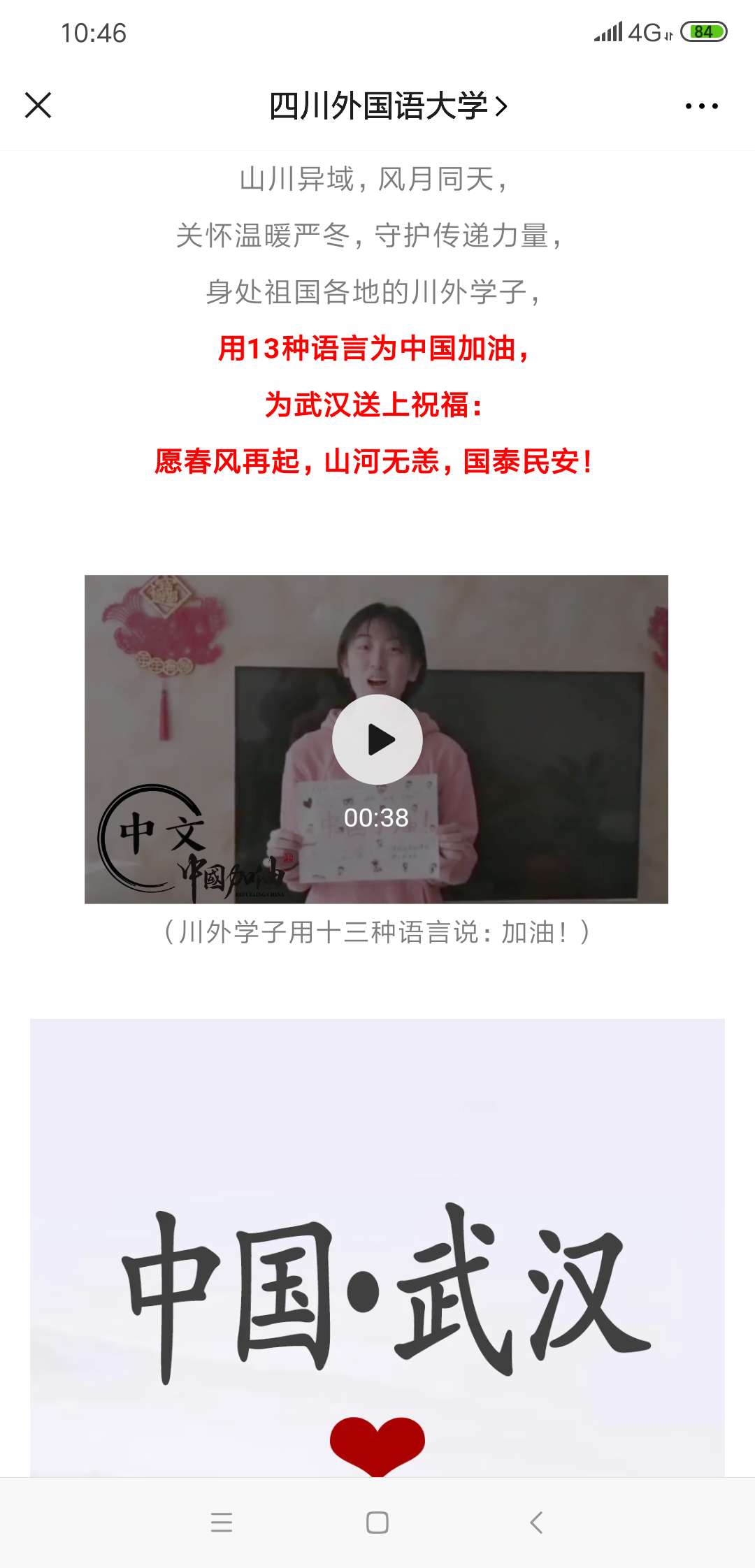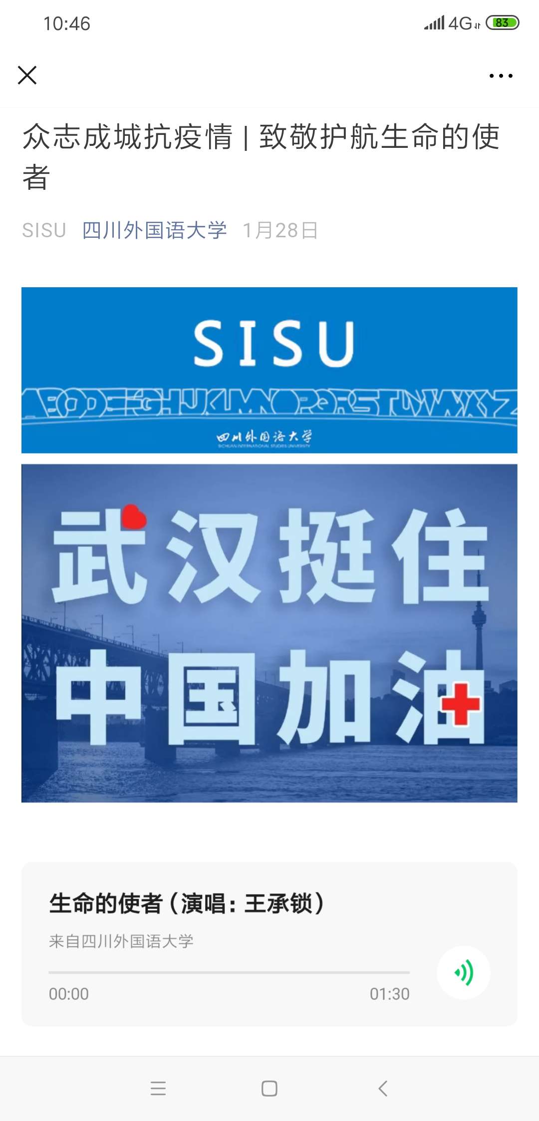 专业助力,凝聚战“疫”力量。积极引导鼓励学生发挥兴趣特长和专业优势,制作一批暖人心、振士气的网络文化作品,致敬一线奋战者,激发“同舟共济、共克时艰”的磅礴力量。四川外国语大学国际文化交流大学生艺术团师生创作歌曲《生命的使者》致敬一线医护人员、校广播台学生录制13种语言《中国,加油!》视频为祖国加油,为武汉送祝福。
