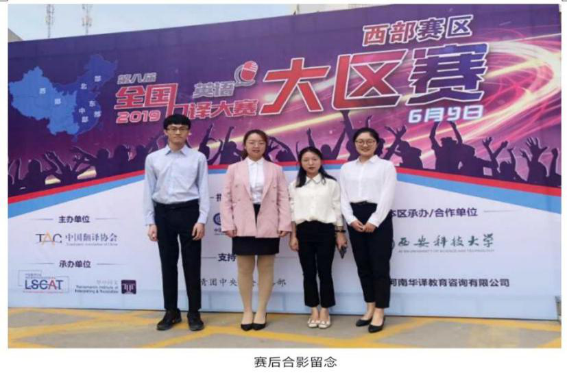 2019年6月9日,由中国翻译协会主办的第八届全国英语口译大赛西部大区赛在西安科技大学雁塔校区隆重举行。来自四川、重庆、云南、甘肃、青海、宁夏、广西、新疆、西藏、陕西等十省(市、区)55所高校的125名选手参加了此次比赛。本次大区赛为期一天。上午进行口译淘汰赛,选手们进行英译汉的角逐,口译试题主题为真菌导致农作物病害以及俄罗斯与亚太经合组织。其中前五十名选手得以晋级下午的第二轮排位赛。在下午的汉译英比赛中,选手们遇到的口译主题为肉类进口。数字和信息均十分密集,涉及话题广泛,对选手的口译能力有很高要求。上下午两轮比赛总分前十二的选手晋级最终的全国总决赛。