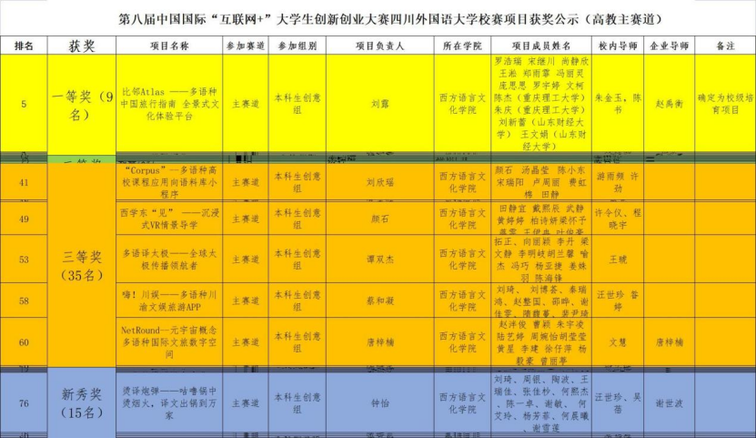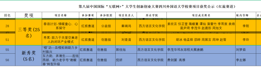 2022年5月21日,四川外国语大学第八届中国国际“互联网+”大学生创新创业大赛于线上成功举行。西方语言文化学院在此次比赛中荣获优秀组织奖,并荣获多项佳绩:校一等奖1项,校二等奖1项,校三等奖7项,新秀奖3项,优秀指导奖3名,新秀指导奖2名,国际项目特殊贡献奖1名。