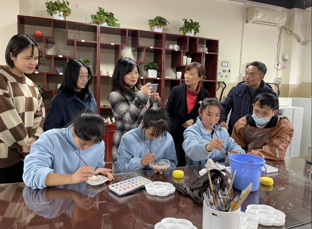 在六十九中校长屈有成、德育部主任谭艳琼的带领下,团队首先参观了该校的陶瓷作坊并欣赏了该校中学生创作的陶瓷作品。屈校长介绍,陶艺课程是该校打造的特色课程,依托于磁器口悠久的瓷器文化,实现“瓷器+文化”“瓷器+劳动”“瓷器+美育”以及“瓷器+艺术”等方面的特色。该课程的开展,一方面可以宣传历史悠久的重庆磁器文化,另一方面能够锻炼学生的实践动手能力,并培养学生的审美素养和艺术情操,有助于增强学生的“文化自信”。屈校长希望借助四川外国语大学的优秀师资力量,为本校师生提供产品、营销等方面相关的指导。