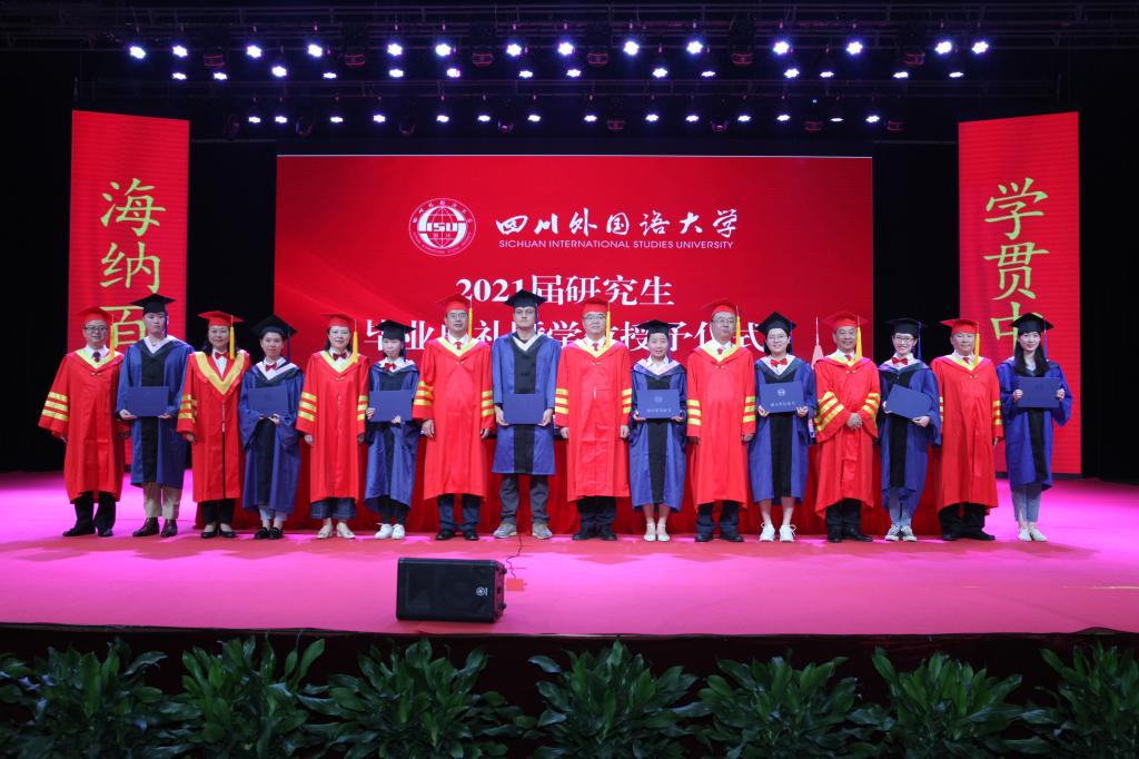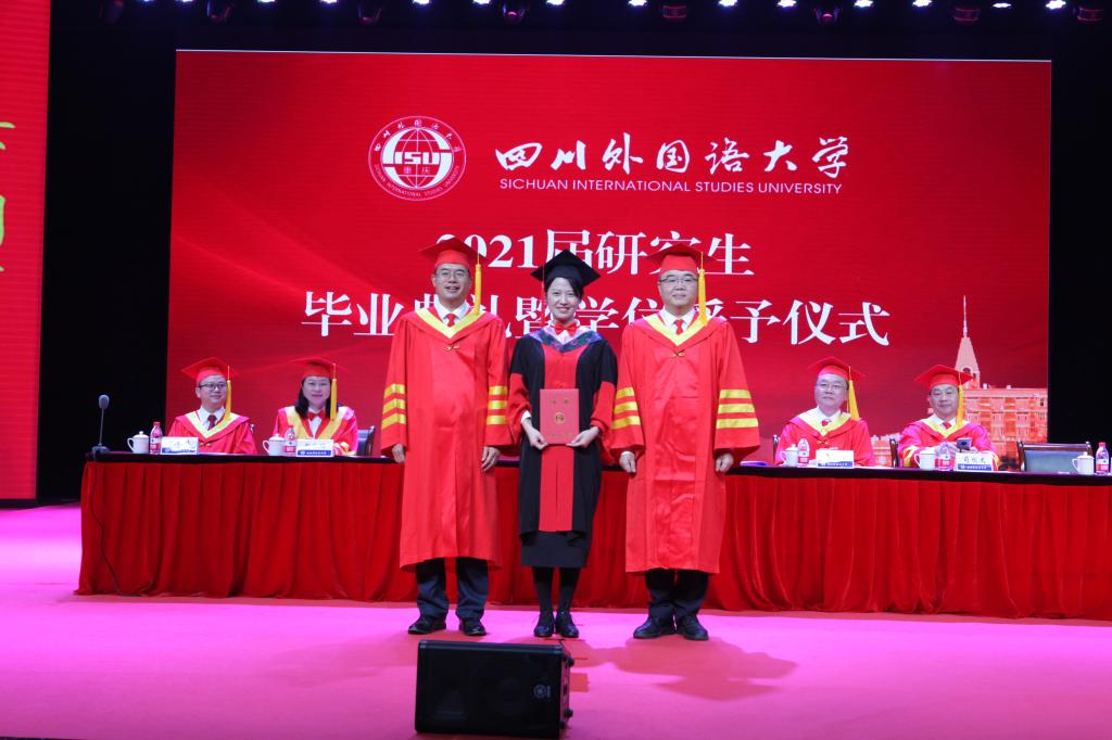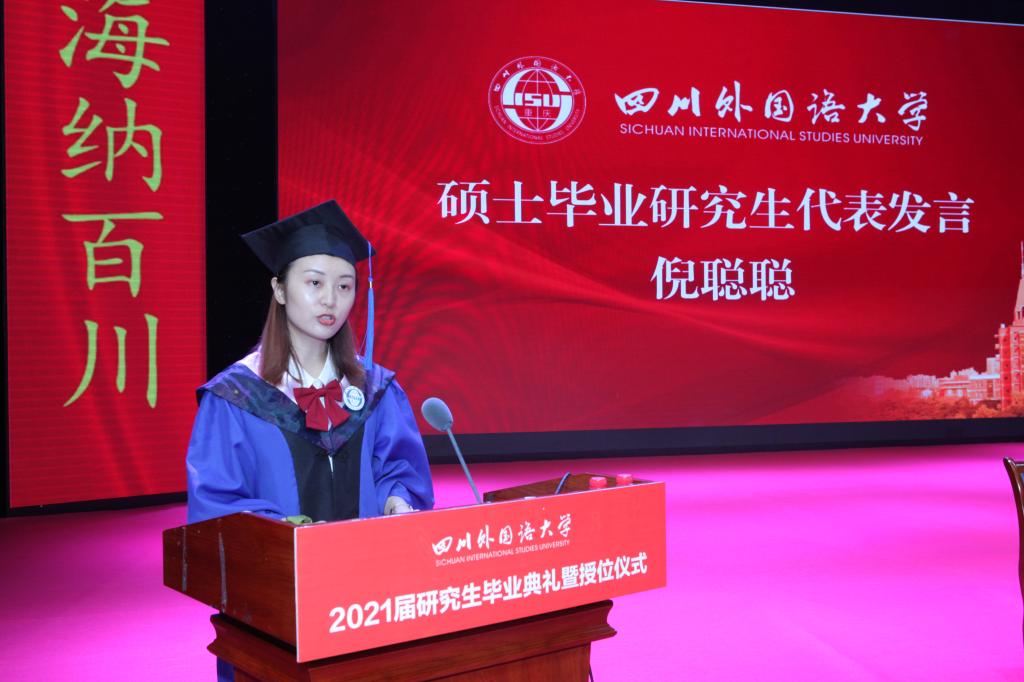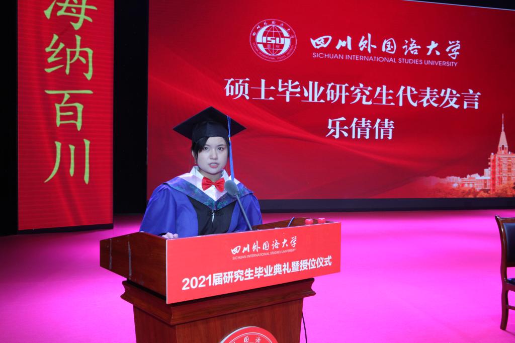 学术硕士毕业研究生代表倪聪聪说在发言中表示:“川外教会了我们坚持内心的宁静、坚定自己的热爱和坚守家国情怀的初心,留给我们永不褪色的精神烙印”。专业硕士毕业研究生代表乐倩倩在发言中用纯正的发音、流畅的英文回顾在母校的经历和拼搏的时光。她表示在今后的工作学习中,以更加开放和包容的心态,锐意进取,奋力拼搏,寻找最好的自己。
