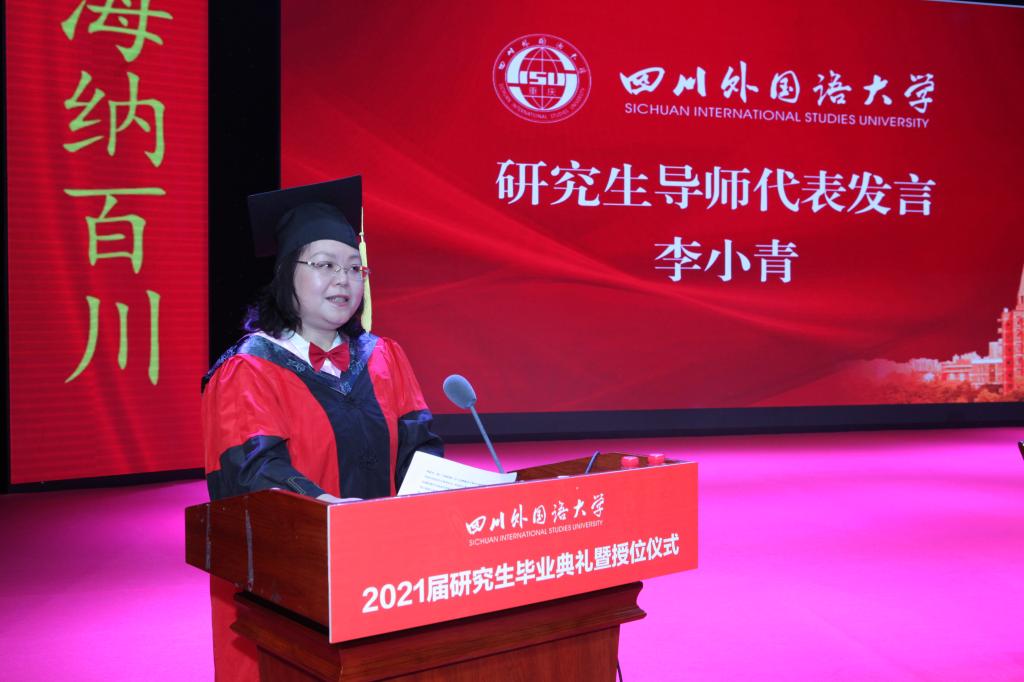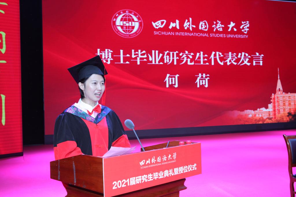 “党的百年峥嵘岁月激励我们砥砺前行。希望未来的我们都能在川外的美好回忆中发现最初的自己,并用川外的精神、校训驱动自己崛起强有力的精神力量,收获生活中的幸福。”博士毕业生代表何荷在发言中深情回顾自己在川外度过的三年春秋,并代表全体博士毕业生向学校和老师致以崇高的敬意和衷心的感谢。