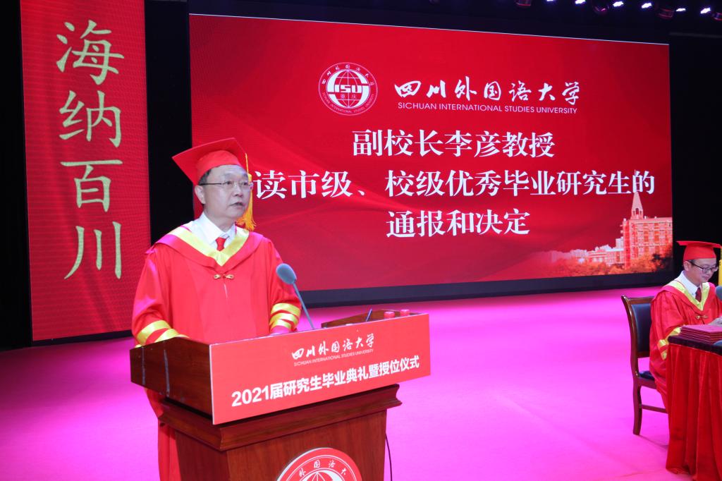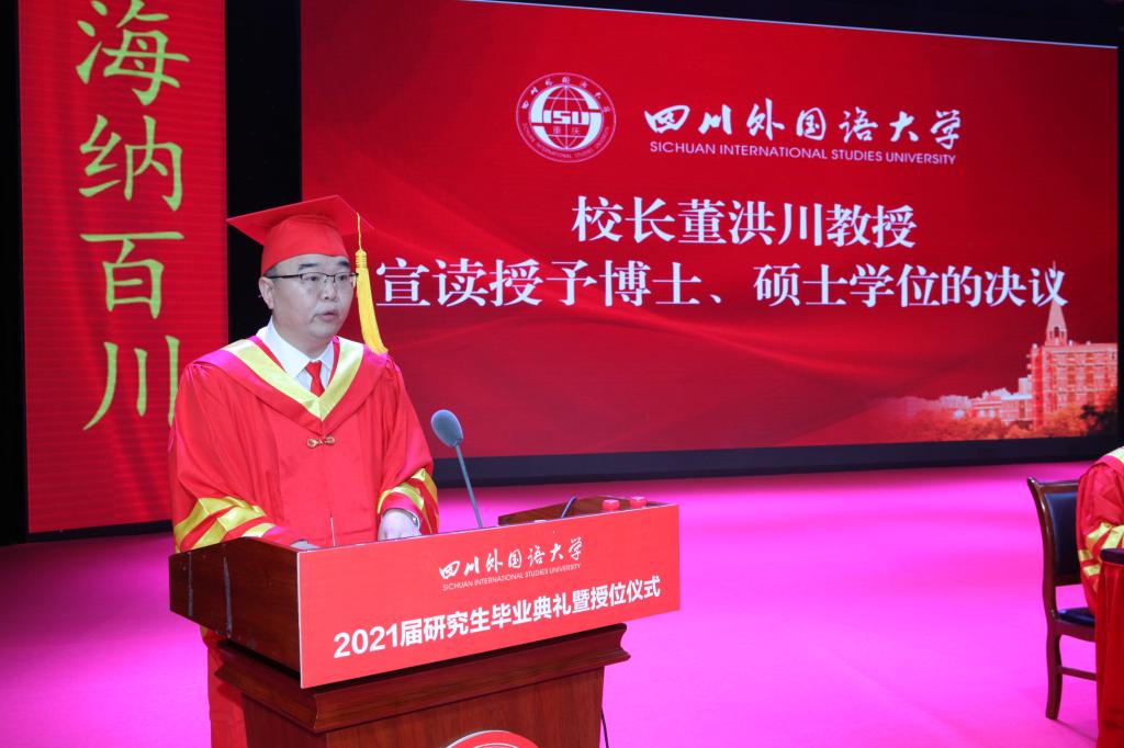 学位评定委员会主席、校长董洪川宣读《四川外国语大学学位评定委员会关于授予711名申请人文博士、硕士学位的决定》。副校长祝朝伟宣读《四川外国语大学关于表彰2021届校级优秀博士、硕士学位论文作者和指导教师的决定》。副校长李彦教授宣读《重庆市教育委员会关于普通高校2021 年学生先进个人和先进集体的通报》和《四川外国语大学关于表彰 2021 年度优秀毕业生的决定》。