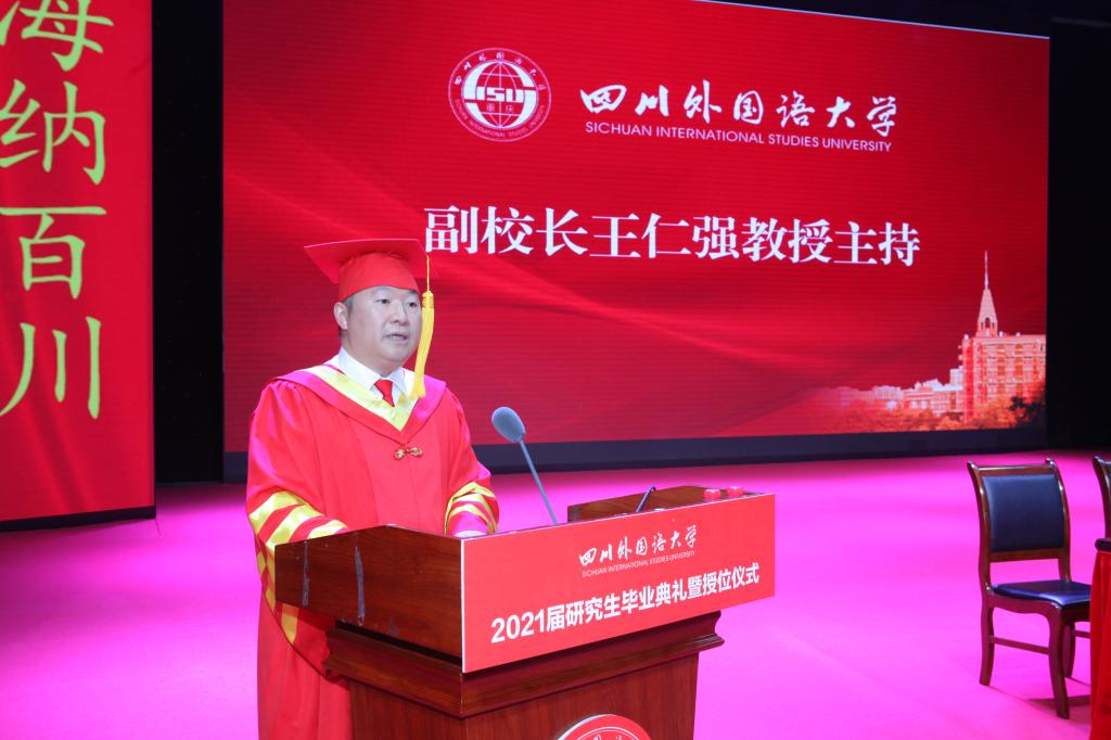 6月28日,四川外国语大学举行2021届研究生毕业典礼暨学位授予仪式。全体校领导出席典礼。2021届毕业研究生、指导教师代表、培养单位负责人及辅导员、相关部门负责人共700多人参加典礼。副校长王仁强主持典礼。