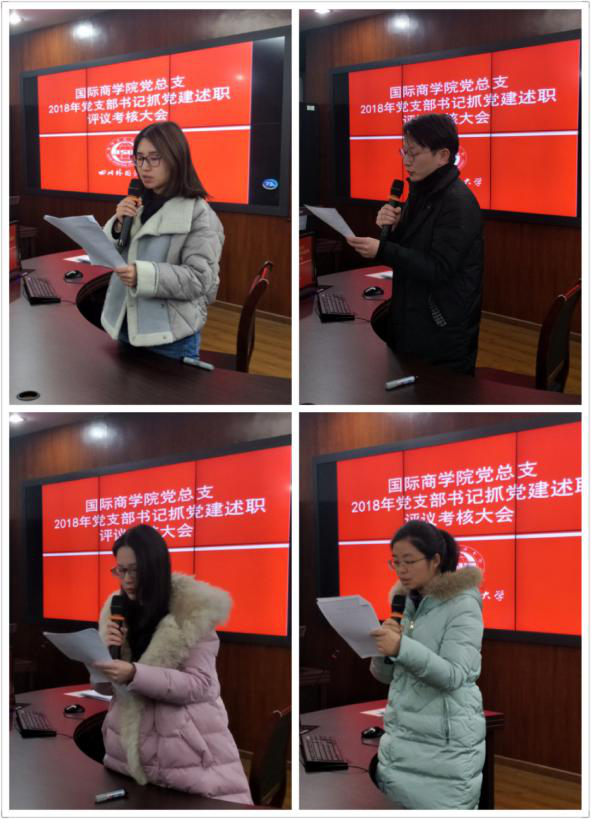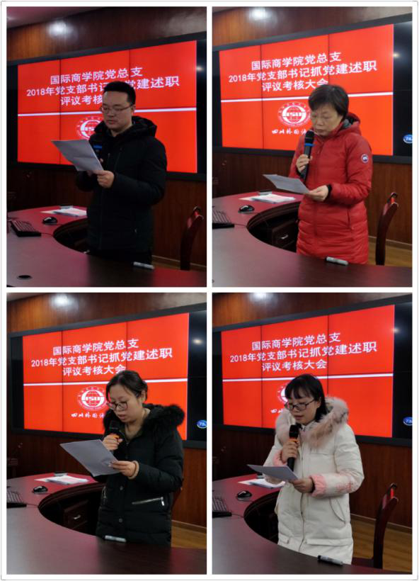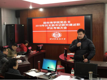 为贯彻全国和全市组织工作会议精神,落实上级党组织关于基层党建工作部署要求,进一步加强基层党支部建设,增强基层党支部书记抓党建工作的主动性和责任意识,1月4日,国际商学院党总支在宏文楼5-8召开了2018年党支部书记抓党建述职评议考核大会。学院领导罗先明、李训、李江、张露丹,全体党总支委员、各党支部书记,党员及群众代表参加了会议。会议由张露丹主持。罗先明对支部书记述职进行了逐一点评,并对述职大会进行了总结。