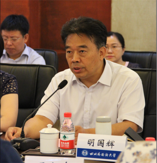 明国辉介绍了近年来学校在“一带一路”大背景下发挥学科与专业优势,服务地方经济社会发展所取得的成果。他谈到,2014年12月,我校和重庆市对外贸易经济委员会共同成立了重庆国际战略研究院。目前研究院已取得了一些成果,出版了《2016年“渝新欧”沿线国家发展报告》和《中国“一带一路”建设对欧亚经济格局的影响——重庆内陆开放型经济发展机遇与途径》,《2017年“渝新欧”沿线国家发展报告》选题也已通过立项。明国辉指出,成立重庆国际战略研究院,旨在创建平台,发挥我校语言类学科的独有优势,为重庆市政府提供战略咨询,为重庆企业走出国门提供对策建议。为实现这一目标,学校已与重庆西部物流园和德勤会计事务所等单位开展了深度合作。