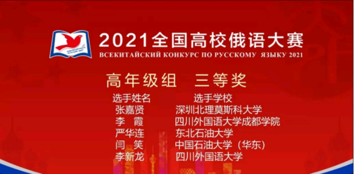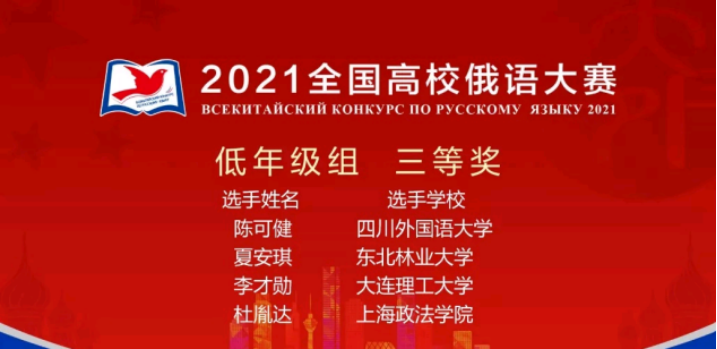 经过初赛、复赛和决赛的激烈角逐,我校俄语学院学生陈可健获低年级组三等奖,李新龙获高年级组三等奖。两位获奖者都将由国家留学基金管理委员会全额资助赴俄罗斯进修或攻读学位。