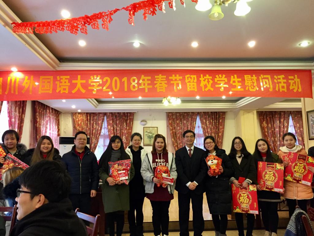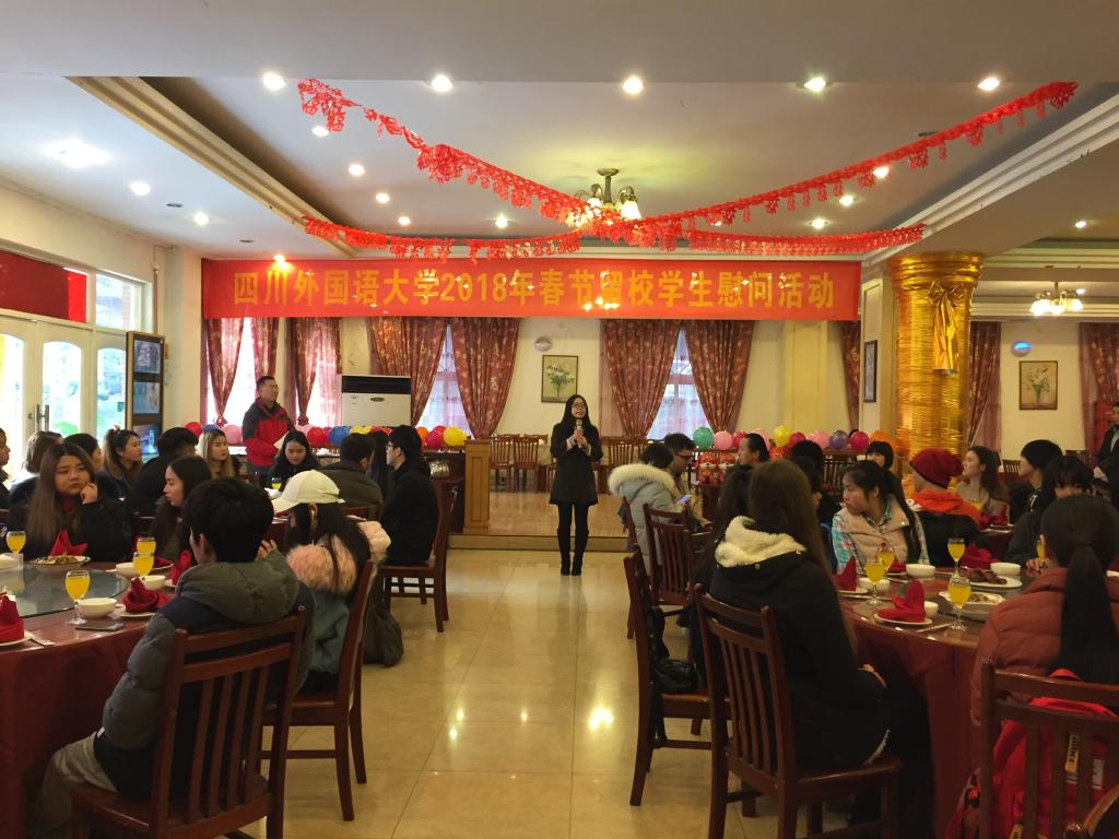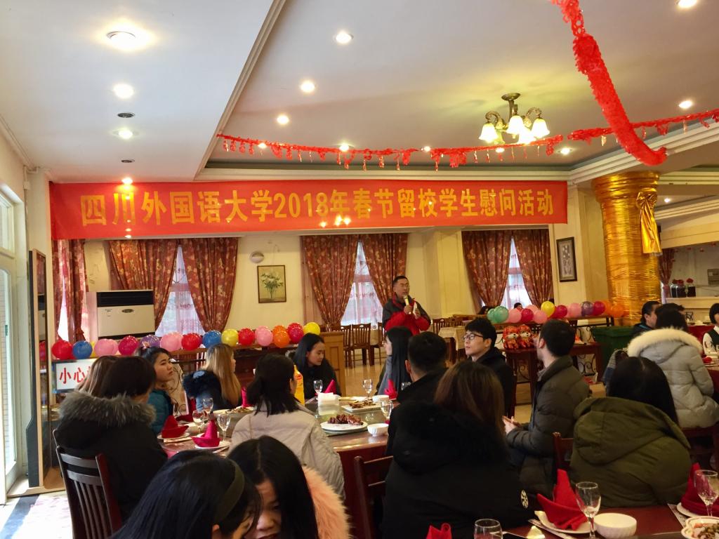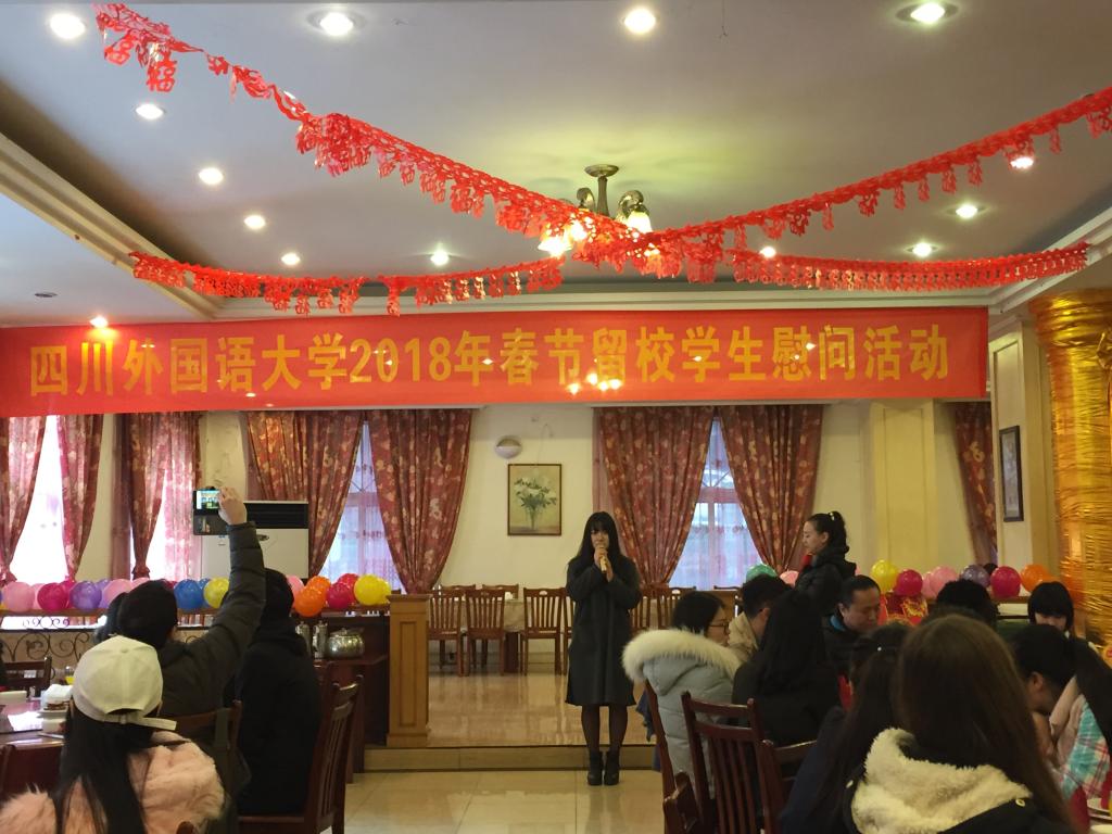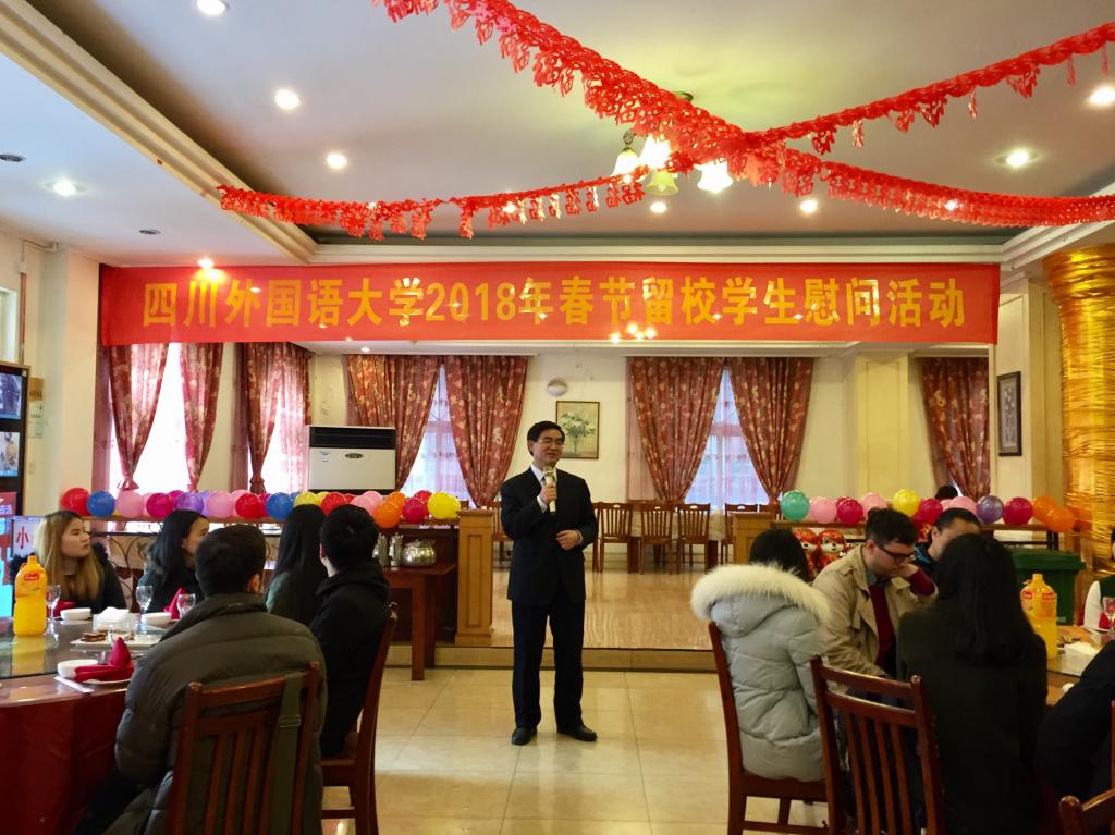 金鸡报晓去,瑞犬迎新来。2月8日中午,在传统农历小年到来之际,学校2018年寒假留校学生慰问活动在东区东苑餐厅举行。校长李克勇、副校长张季菁、学生工作处处长吴维均、学生工作处副处长苏雪、研究生院党总支书记淡修安、国际关系学院书记申安桂、国际商学院辅导员宋璐、留学部的外教、学生工作处老师郑学美、朱磊、向梦等,与60多名来自各院系、留学生部留校学生欢聚一堂、共迎新春。活动由学生工作处处长吴维均主持。