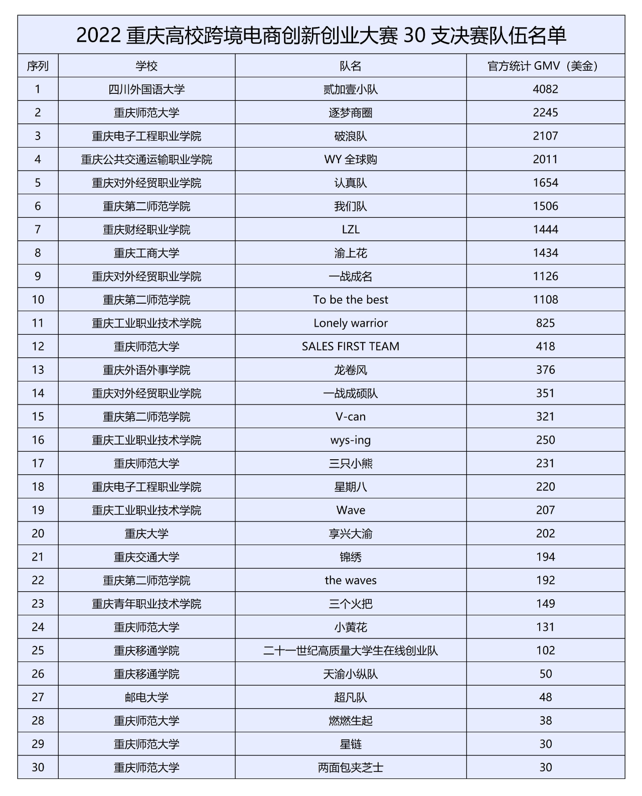 经过近3个月的线上培训、理论考试和实战排位赛角逐,我校孔雯诗、谭青松、李彦秀三位同学组成的“贰加壹小队”以GMV(全称Gross Merchandise Volume,即商品交易总额)4082美金的成绩排名第一,与重庆大学、重庆师范大学、重庆工商大学、重庆交通大学等高校的30支队伍会师决赛。