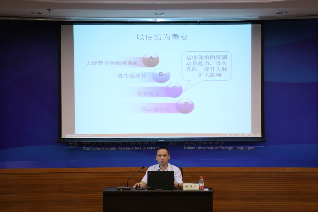 在此次培训中,胡登全就如何开拓孔子学院工作,进行了“以团结为起点”“以质量为抓手”“以需求为导向”“以当地多方为推力”“以使馆为舞台”“以中企为支点”“以活动为辐射”六个主题的讲座。胡登全认为,孔子学院要以“融入、拓展、共享、共赢”为办学理念,要把握外方特点,刚柔并济,有策略地开展合作;教学工作要紧紧围绕“三教”,搞好教师的选拔培训,做好教材的遴选和本土化,推进教法的研讨,提升HSK考试质量;要把握学生需求、当地需求和中国国家需求,培养学生的中国情怀;要甄别交往对象,利用特长,融入当地,树立威信,助推孔院,趋利避害;要以使馆为舞台,借助使馆的资源动员能力,宣传孔院,扩大影响;要与当地机构与中企达成协作,联合培养学生,实现特色化、专业化和职业化;要重视文化活动的辐射作用,形成常规活动、特色活动和品牌活动的互补,尤其要打造活动的价值流和影响链。