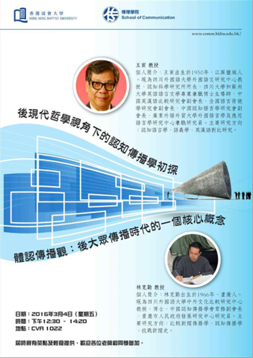 应香港浸会大学副校长兼传理学院院长黄煜教授的邀请,我校博士生导师、外国语文研究中心王寅教授,中外文化比较研究中心(新闻传播学院)林克勤教授于3月3日至3月6日赴香港浸会大学讲学。