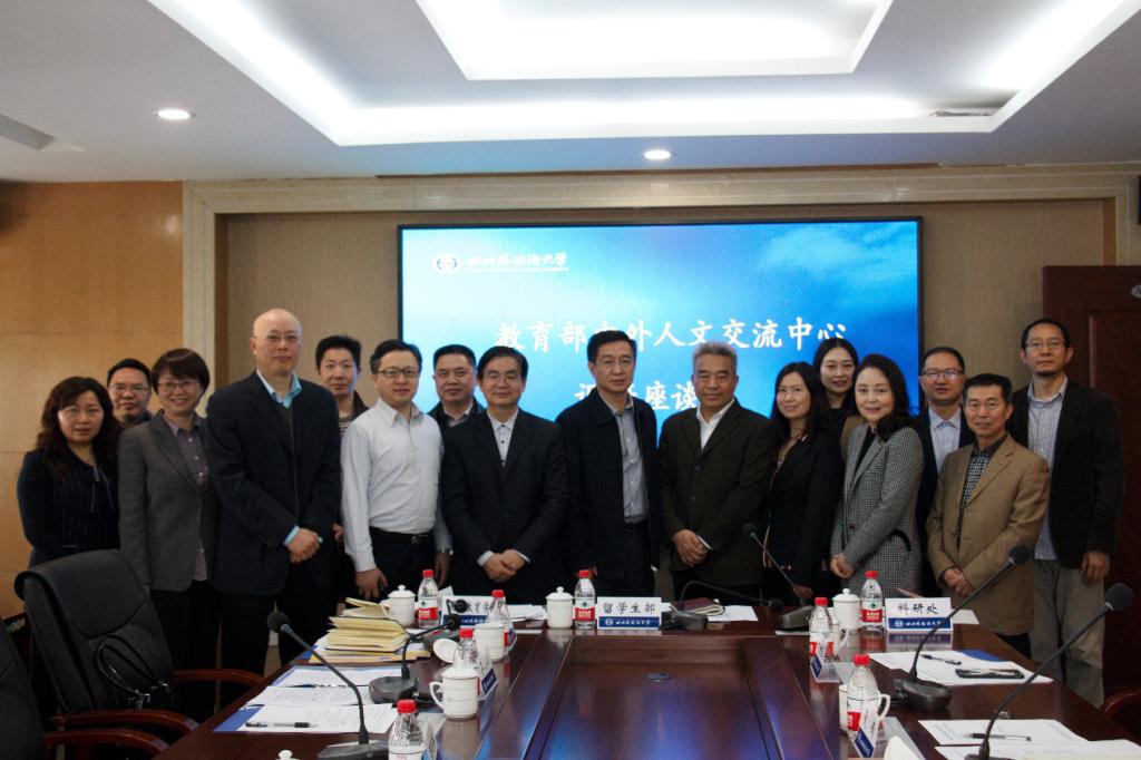 2019年3月28日(周四)上午,教育部中外人文交流中心主任杜柯伟、副主任夏娟、机制二处处长陈滔伟、项目官员梁静一行4人到访川外调研,调研学校教育人文交流情况,重庆市教育委员会国际合作与交流处处长李世玉陪同访问。