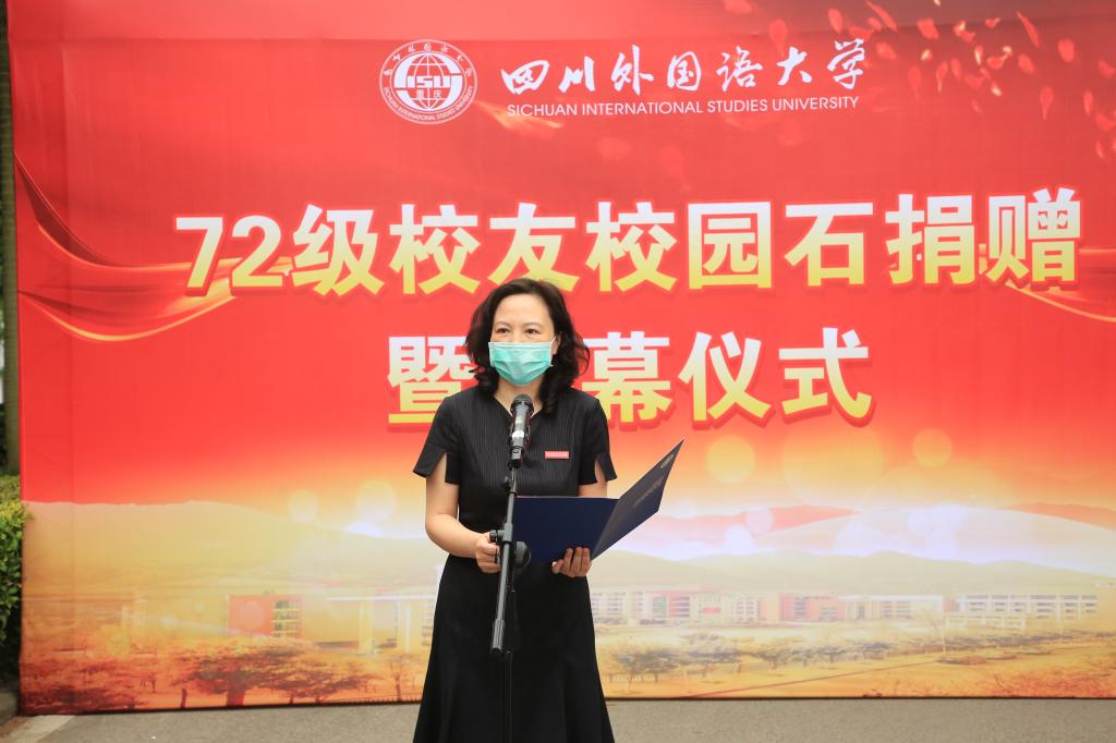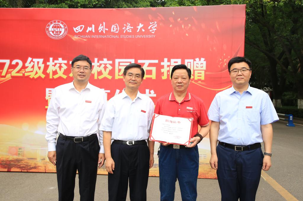 5月20日,学校在三花路举行了72级校友校园石捐赠暨揭幕仪式。党委书记邹渝,校长董洪川,副校长苟朝莉、李小川,纪委书记苟欣文及校友会代表、相关职能部门及部分院系负责人、72级校友代表及教师代表、学生代表出席了揭幕仪式。揭幕仪式由苟朝莉主持。