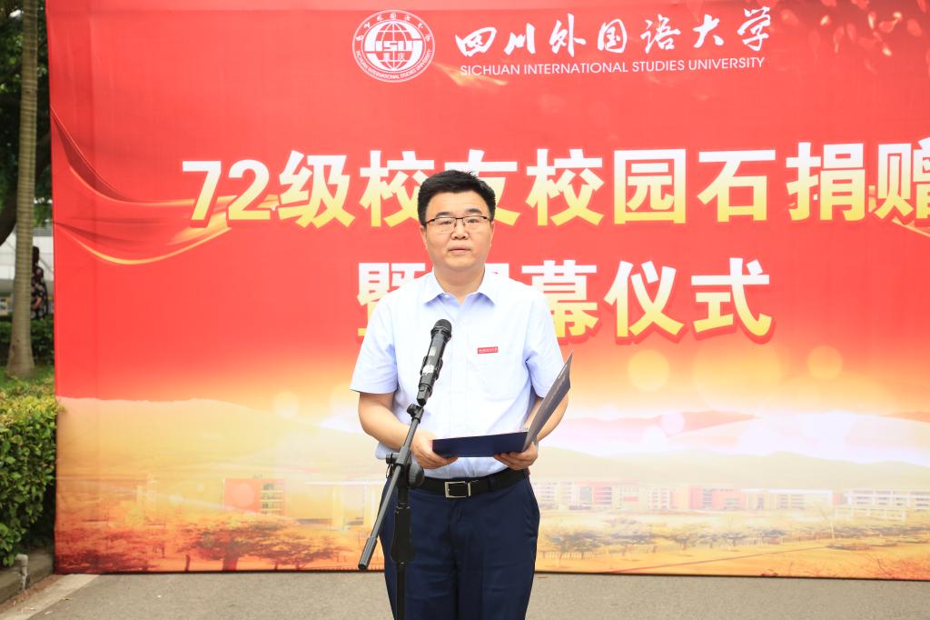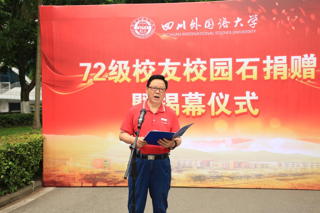 董洪川代表学校向全体72级校友致以衷心的感谢和问候,向返校的校友代表们表示热烈的欢迎。他说,72级校友是川外优秀的一届毕业生,在不同的岗位上奋勇拼搏,辛勤奉献,取得了骄人的成绩,为祖国的改革开放和建设发展做出了积极的贡献,无愧于祖国和母校的教育培养,是名副其实“闪光的72级”。此次校园石的捐赠和揭幕,是70周年校庆的一项重要活动,精心选择了校门附近这个醒目的位置,既包含着对全体72级校友爱校之情的崇高敬意,又是对所有川外人的激励与鞭策,提醒每一位川外人,不忘川外历史、践行川外校训、传承川外精神,海纳百川,学贯中外。他表示,学校70周年校庆工作依然有序推进,期待与校友们相聚,共话母校情深,共谋学校发展。