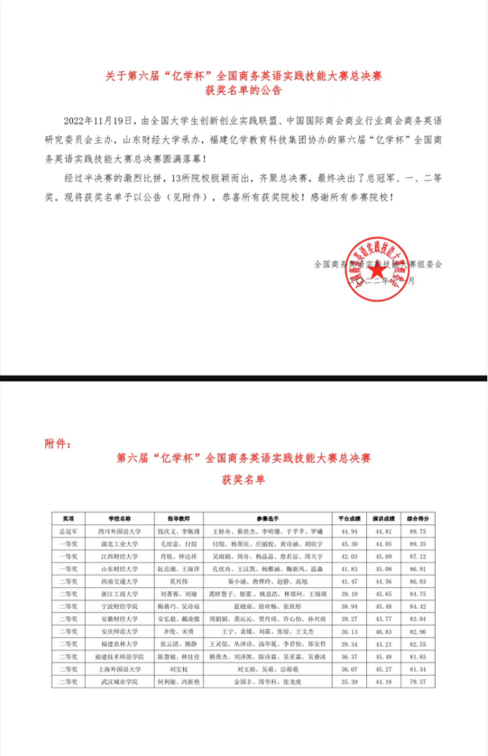 11月19日,2022年“亿学杯”全国商务英语实践技能大赛全国总决赛在线举行。全国参赛高校有600多支队伍,晋级总决赛的有49支队伍。由商务英语学院钱庆义、李佩瑾老师指导的参赛队伍Watchtower沉着应战,与上海外国语大学、西南交通大学、中南财经政法大学、上海对外经贸大学等强队同台PK,经过激烈争夺,最终以89.75的总成绩荣获全国总冠军,这是川外参加“亿学杯”获得的第一个全国总冠军,创造了川外在该项赛事的最好成绩,也是西南赛区高校获得的首个全国总冠军。