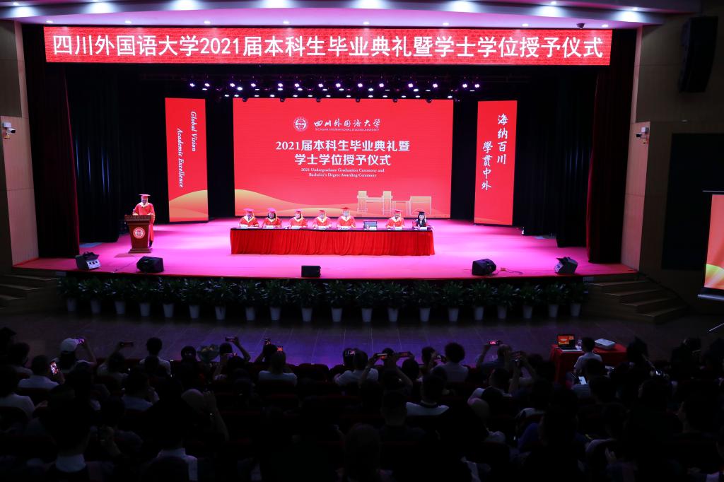 “母校诚挚欢迎你们常回家看看,忆往昔、看今朝,畅未来!”6月29日上午,四川外国语大学2021届本科生毕业典礼暨学士学位授予仪式在东区大礼堂隆重举行。我校校领导出席典礼,共同见证毕业生们人生的美好时刻。学校相关职能部门负责人、各学院党政负责人、校友代表、教师代表、全体毕业生辅导员以及2021届本科毕业生及家长代表参加典礼。典礼由副校长李彦主持。