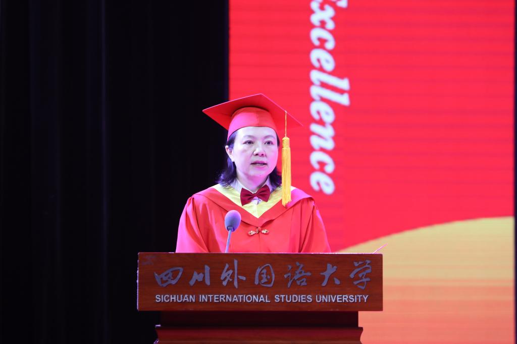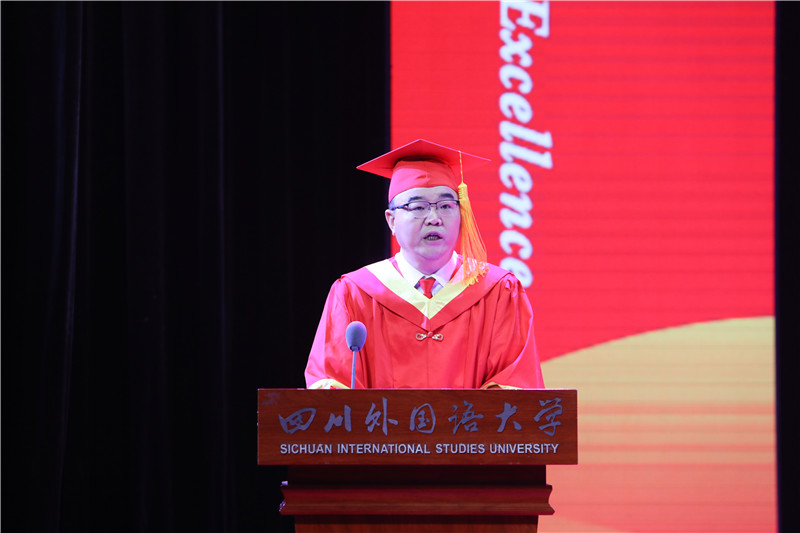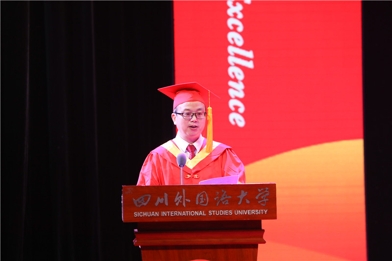 “我们爱川外,不仅仅是我们需要川外,更希望有一天我们在社会上有所成就的时候,再回来报答母校。怀着一颗感恩的心,自然心正行远。”原英语系2002级校友、重庆慧发网络科技有限公司、东莞市慧发刺绣有限公司总经理李善兵作为校友代表发言。他分享了自己为家乡的小学捐赠衣物,感受到价值和意义的故事,激励毕业生们大胆付出,为人民服务,做更优秀的自己,回报社会,回报母校。