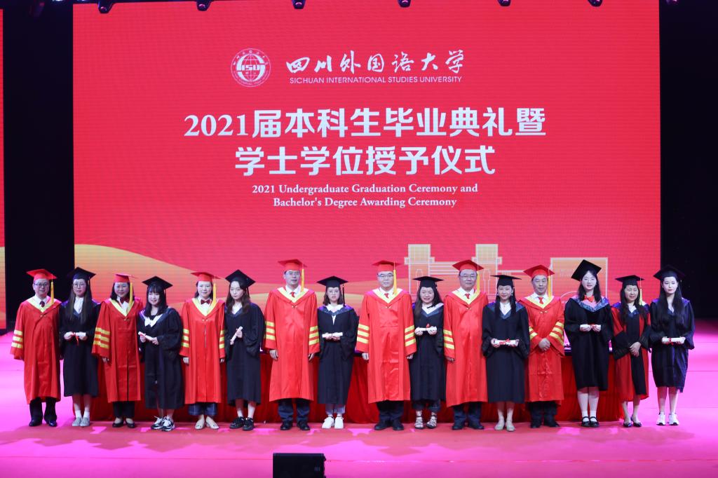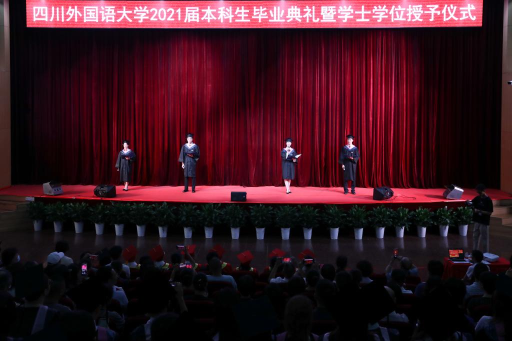 党委副书记苟朝莉宣读《重庆市教育委员会关于普通高校2021年学生先进个人和先进集体的通报》《四川外国语大学关于表彰2021年度优秀毕业生的决定》《四川外国语大学关于表彰2021届本科毕业生就业创业先进个人的决定》。在热烈的掌声中,同学们依次上台接受表彰。副校长祝朝伟宣读《四川外国语大学关于授予2021届冯殊媛等3293名普通全日制学生学士学位的决定》。