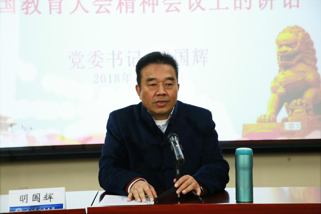 明国辉在报告中指出,全国教育大会是党中央在中国特色社会主义进入新时代召开的第一次全国性教育会议,具有划时代和里程碑的意义。习近平总书记在会上发表重要讲话,从党和国家战略全局的高度,系统总结我国教育事业发展的成就和经验,深刻分析面临的新形势,深刻阐述教育优先发展的重大意义,科学回答“培养什么人、怎样培养人、为谁培养人”一系列根本性问题。具有极强的政治性、思想性、战略性和现实针对性,是做好新时代教育工作的纲领性文献。