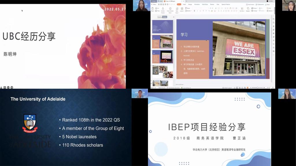 5月27日下午,国际处邀请了UBC VSP项目2019年学员陈明坤、国际商业体验实习项目(IBEP)2022年寒假学员曹芷涵、英国埃塞克斯大学学分项目2021年学员朱泳莉和澳大利亚阿德莱德双硕士项目2021年学员王子帅做线上分享,讲述其学习/实习心得,并根据自身经历向参会同学们提出学业规划建议。分享会上,同学们在评论区积极互动,气氛热烈,获益颇丰。