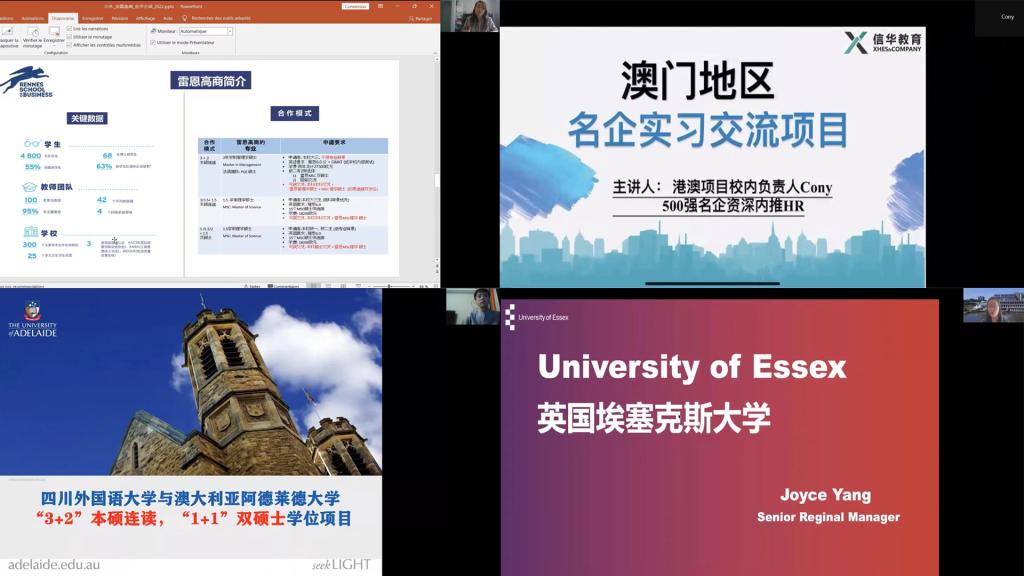 5月25日-27日期间,国际处举办了多场线上项目说明会。合作高校/机构的项目负责老师分别就法国诺恩商学院学位项目、法国雷恩商学院学位项目、澳大利亚阿德莱德大学学位项目、英国埃塞克斯大学学分项目及赴澳门访学/实习项目进行详细的介绍,并进行在线答疑。同时,国际处项目科老师在线宣讲了学校的学生出国(境)学习/实习政策及“四川外国语大学学生留学基金”信息。