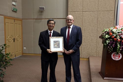 随后,澳大利亚纽卡斯尔大学的副校长richard dunford讲话。他首先感谢川外各位同仁的辛勤努力和惊人的高效率,促成了两校的最终实质合作。他提到,澳大利亚纽卡斯尔大学特别重视这个项目,自己推掉了国内重要行程专门前往参加此项目的开学典礼,并强调了这个项目充分发挥中澳双方高校各自的优质资源,有利于学生各方面得到锻炼,帮助促进自身发展。希望同学们抓住机会,好好学习。这个项目亦将极大地为川外和纽卡斯尔大学的进一步国际化做出重要贡献。讲话期间richard dunford副校长还赠送了李克勇校长一幅澳大利亚著名画作以示感谢,李校长亦回赠了具有川外特色的礼物。