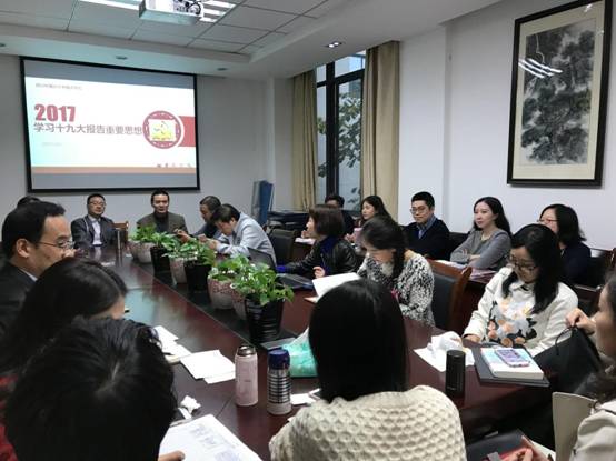 2017年10月23日12点30,在B109会议室翻译学院教工支部召开了学习十九大报告重要思想的主题党日活动。分管学院的祝朝伟副校长、党建工作督导贾锡本老师与支部的党员教师和学院民主党派教师及群众一起参与了本次学习。会议由教工支部书记唐昉主持。