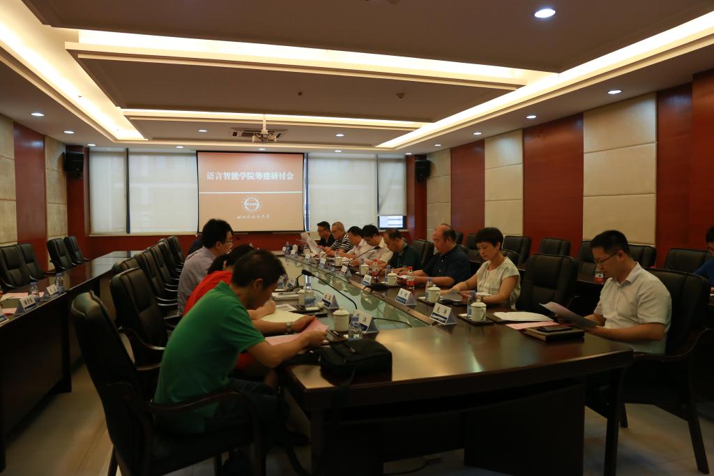6月27日下午15:30,四川外国语大学语言智能学院筹建研讨会在图书馆505会议室召开。重庆邮电大学光电工程学院王巍教授、重庆大学计算机学院周庆教授等专家应邀与会,我校党委书记明国辉、校长李克勇、副校长董洪川和祝朝伟出席了会议,党政办、研究生院(学科办)、教务处、教育发展研究院、翻译学院、教育学院、教技中心、计财处、资产管理处等部门负责人以及语言脑科学研究团队参加了会议。会议由董洪川主持。