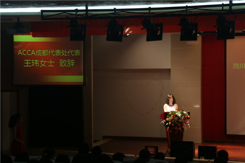 acca成都代表处代表王玮用流利的英文为毕业典礼致辞,她在恭喜acca班取得的成绩之余,简要分析了当下会计及金融专业的学生所面临的机遇与挑战,为acca班的同学提出了相关建议及鼓励。