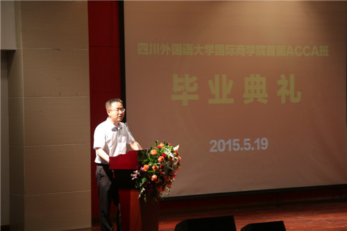 5月19日下午,川外国际商学院首届财务管理acca(国际注册会计师)卓越人才教改班毕业典礼在我校图书馆报告厅举行。出席本次毕业典礼的嘉宾有:副校长王鲁男,教务处处长廖巧云,学生工作处副处长古晶;acca成都代表处王玮女士,王怀蜀女士,楷博教育温国峰先生;国际商学院院长杨柏,党总支书记高绍邦,副院长李训,副院长李江,党总支副书记檀春耕,acca教师代表周洁,acca首届班主任鲜京宸以及家长代表和acca教改班各年级的同学。
