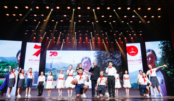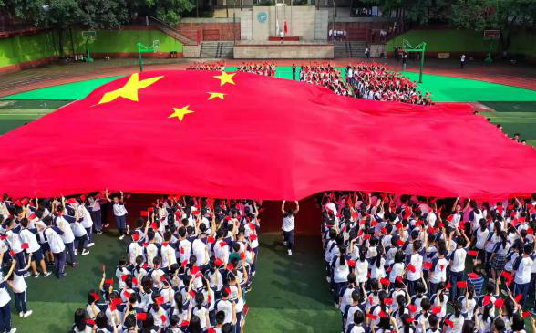 9月23日,为庆祝中华人民共和国成立70周年,附中组织全体师生开展了“我和我的祖国,一刻也不能分割”歌唱活动。巨幅的国旗在校园飘荡,同学们挥舞国旗,集体歌唱《我和我的祖国》,用青春的声音向祖国深情告白,向中华人民共和国成立70周年献礼。