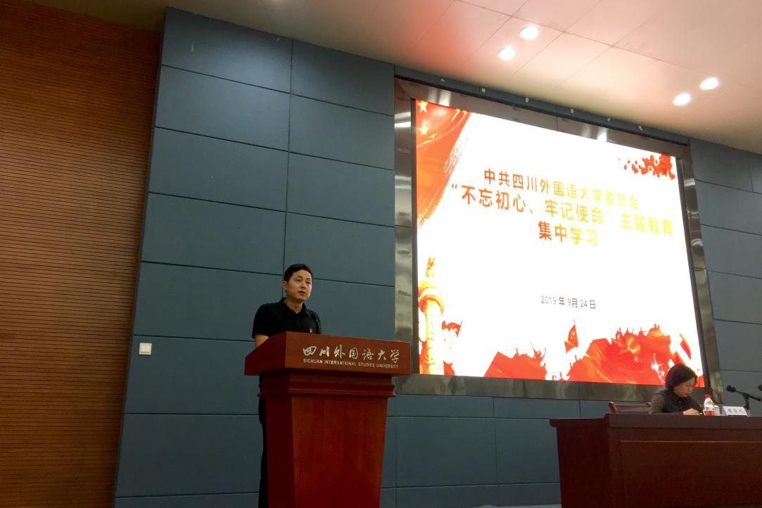 2019年9月16日,中共四川外国语大学委员会召开“不忘初心、牢记使命”主题教育工作会议,附中分党委迅速组织传达会议精神,结合工作实际,成立附中分党委“不忘初心、牢记使命”主题教育领导小组,由附中分党委书记、校长唐刚任组长,副书记、副校长唐东、纪委书记、副校长沈嘉任副组长,其他校级党员干部任组员,成立领导小组办公室,下设综合、协调和宣传3个工作组;制定《中共四川外国语大学附属外国语学校委员会开展“不忘初心、牢记使命”主题教育实施方案》,按照实施方案推进落实主题教育活动。