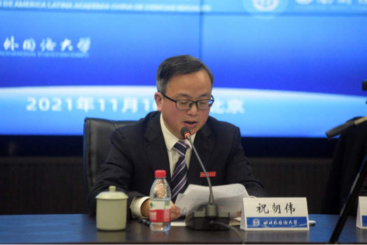 在主旨发言环节,祝朝伟教授从“中拉关系”、“重庆与拉美友好合作”、“川外的拉美教学与研究”三个层面阐述了如何助推中拉全面合作伙伴关系发展。他表示,中国和拉美国家同属于发展中国家,面临着共同发展的现实任务,双方形成了相互依存的命运共同体。展望后疫情时代,双方面临相似的发展挑战和治理困境,亟待以“共商、共建、共享”精神推进发展战略对接,实现共同发展。近年来重庆与拉美不断加强务实合作,高层互访日益频繁,经贸往来日益密切,人文交流不断深化。四川外国语大学历来重视与拉美相关的国别与区域教学研究。未来,在“新文科”和“国际化特色高校”建设背景下,我校将一如既往秉持“海纳百川,学贯中外”的校训精神,从人才培养、科学研究、社会服务等各方面助力中拉交流,为国家和地方的外事工作贡献自己的力量。