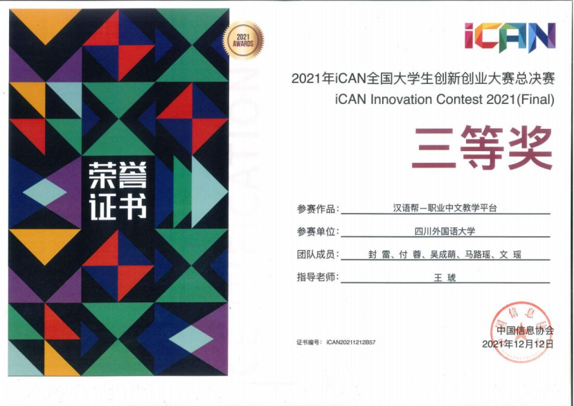 2021年iCAN全国大学生创新创业大赛全国总决赛于2021年12月10日到12日举办,本次大赛由中国信息协会主办,山东大学承办。我校中文学院研究生封雷、付蓉、吴成萌、马路瑶、文瑶同学共同完成,中文学院王琥老师指导的项目“汉语帮——职业中文教学平台”荣获全国总决赛三等奖。此项获奖是近五年来我校研究生在创新创业类竞赛首次获得国家级荣誉,取得获奖新突破。