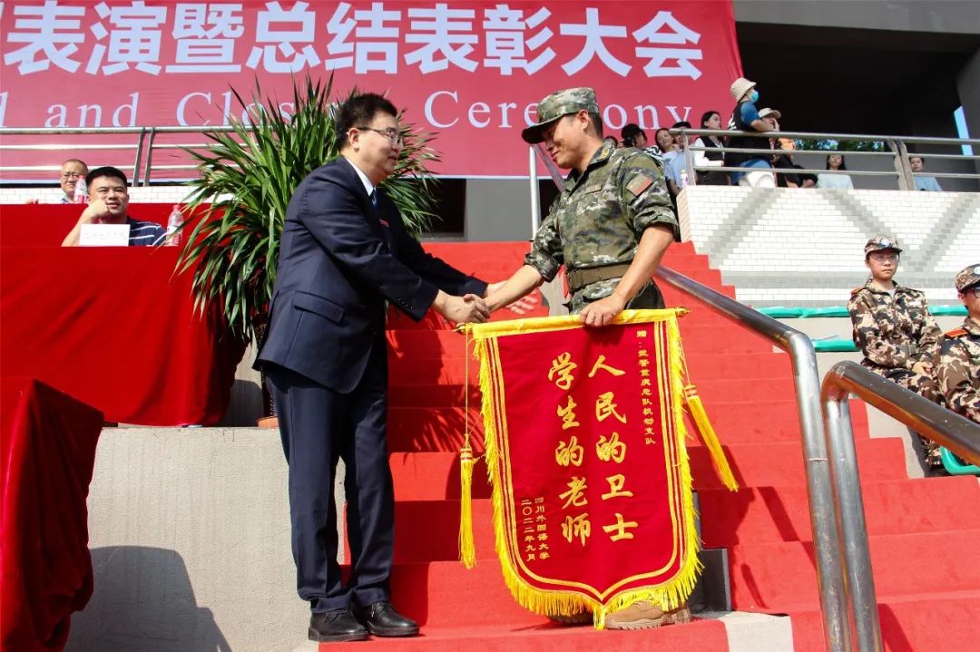 汇报表演结束,卢波宣读《四川外国语大学关于表彰2022级本科学生军训优秀连队和优秀学员的决定》,校领导和嘉宾向本次军训先进集体与个人进行授奖,董洪川代表学校向承训部队赠送锦旗。