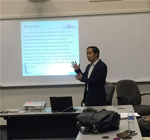 3月27日上午,我校人事处彭程教授应美国肯特州立大学工商管理学院金融系主任steven dennis教授的邀请,面向工商管理学院教职员工以及博士研究生做了题为“interactive decisions of investment and financing,and the fulfillment of corporate social benefits”的学术讲座。学术讲座由金融学教授jay muthuswamy主持。 在报告中,彭程教授以2008年金融危机为切入点,详细介绍了目前国内外企业在投融资决策上存在的普遍问题,并提出了企业亟需完善投融资决策模式的观点。在此基础上,他展现了其近期有关投融资决策模式优化的最新理论研究成果。与此同时,他详细介绍了以中国上市公司为样本的实证研究方法和研究成果,并对未来的研究设想进行了简要的陈述。 在报告后的提问与讨论环节,工商管理学院师生对该报告的题材表现出浓厚的兴趣,并对彭程教授的理论研究方法、理论研究模型构建、实证样本选取、实证模型构建等多个方面进行了提问与讨论,尤其对其在实证模型的构建和创新上进行了较高的评价和认可。与此同时,他们对该项目如何在未来继续深化和完善提出了建设性的意见。整个报告获得了较大的反响,部分师生甚至表示希望未来能够在该领域与彭程教授进行研究合作。 彭程教授精彩演讲 讲座现场