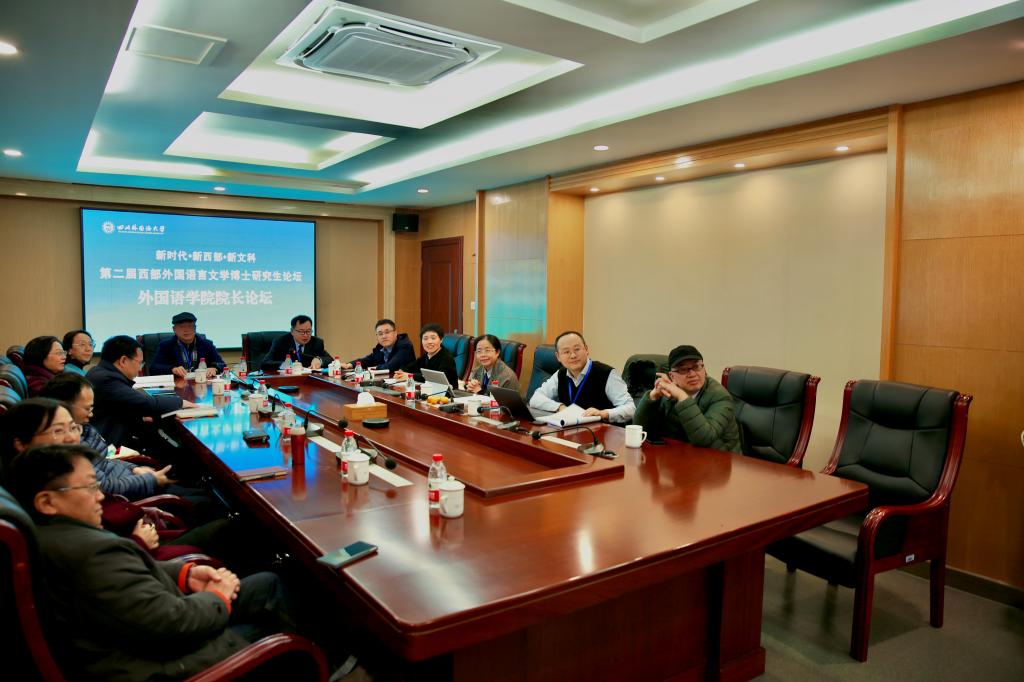 2021年11月27-28日,以“新时代•新西部•新文科”为主题的第二届西部外国语言文学博士研究生论坛在我校举行。本次论坛设有外国语学院院长论坛,来自全国20所高校的31位外国语学院院长和研究生培养负责人,以线上、线下相结合的方式参会,围绕研究生招生、培养、学位、师资队伍等议题展开了研讨和交流。