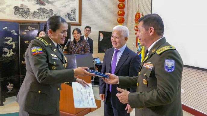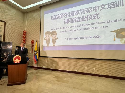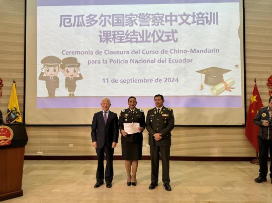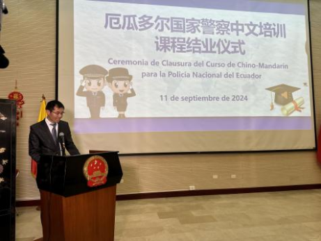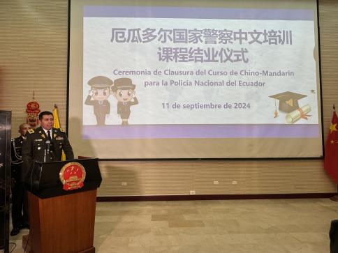 当地时间9月11日,中华人民共和国驻厄瓜多尔大使馆与思源中国语学校孔子课堂联合开设的厄瓜多尔国家警察中文培训课程结业仪式在中华人民共和国驻厄瓜多尔大使馆举行。中华人民共和国驻厄瓜多尔大使陈国友,厄国家警察首都大区司令 Henry Roman Tapia Lafuerte (以下简称塔皮亚司令)、思源中国语学校校长曹孝宏及参培师生出席此次仪式。
