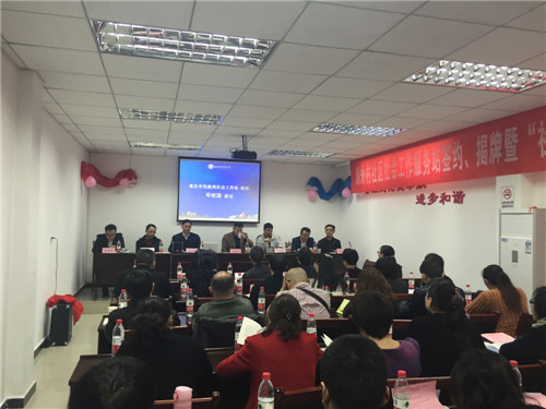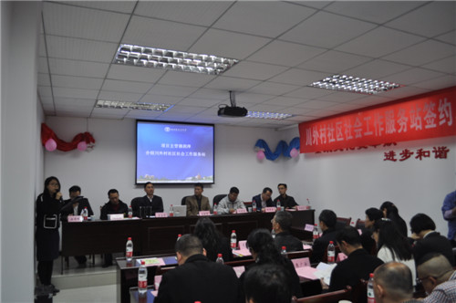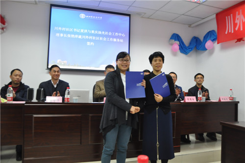 服务站项目主管穆莉萍首先从成立的背景、发展定位、服务内容等对川外村社会工作服务站做了简要介绍。随后川外村社区党支部书记夏洪与重庆扬光社会工作服务中心理事长张艳萍就川外村社区社会工作服务站进行签约。王金亭书记和王鲁男副校长为川外村社区社工服务站揭牌。