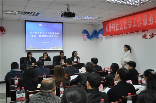 社会工作与社区发展”培训交流座谈会。座谈会后,与会人员一同观摩了社会学系举办的川外村社区扶贫济困义卖邻里节活动。王鲁男副校长、重庆市民政局社会工作处处长邓明国、沙坪坝区民政局副局长杨文钰、童家桥街道书记王金亭、主任张路春等领导以及社会学系的部分师生参加了此次活动。服务站揭牌、签约仪式