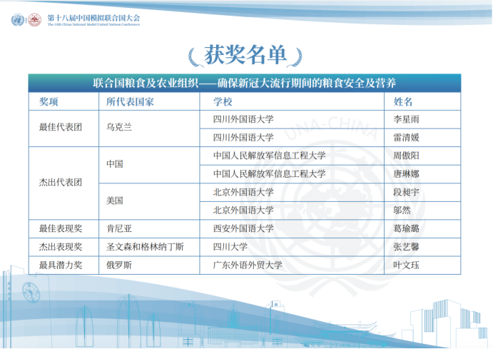 本次大会以“踔厉奋发、勇毅前行,为推动构建人类命运共同体贡献青年力量”为主题,共设置联合国大会第一委员会(UNGA First Committee)、联合国经社理事会(UN ECOSOC)、联合国大会第三委员会(UNGA Third Committee)、联合国工业发展组织(UNIDO)、联合国环境规划署(UNEP)和联合国粮食及农业组织(FAO)六个委员会,吸引全国73所高校学生模拟国家代表,参与国际热点问题讨论,旨在向高校青年学生宣传联合国理念,普及联合国知识,培养具有国际视野和参与全球治理能力的高素质青年人才。通过熟悉议事规则、坚定国家立场、完善文件撰写、积极讨论磋商等实践,广大参会代表从中拓宽青年视野、树立青年意识、锻炼学术写作与英语演讲辩论综合素养,为世界贡献青年声音、青年方案和青年力量。