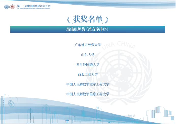在为期四天的会议中,我校代表在各自委员会踊跃发言、积极参与,在一次次英文演讲辩论以及文件写作中脱颖而出,获得了大使评委团的一致认可,再一次斩获大会的最高奖项——最佳代表团奖(Best Delegation)。同时,我校代表团也凭借着指导教师与学生代表卓越出色的表现和充分深入的参与,荣获了大会的最佳组织奖(Best Organization)。